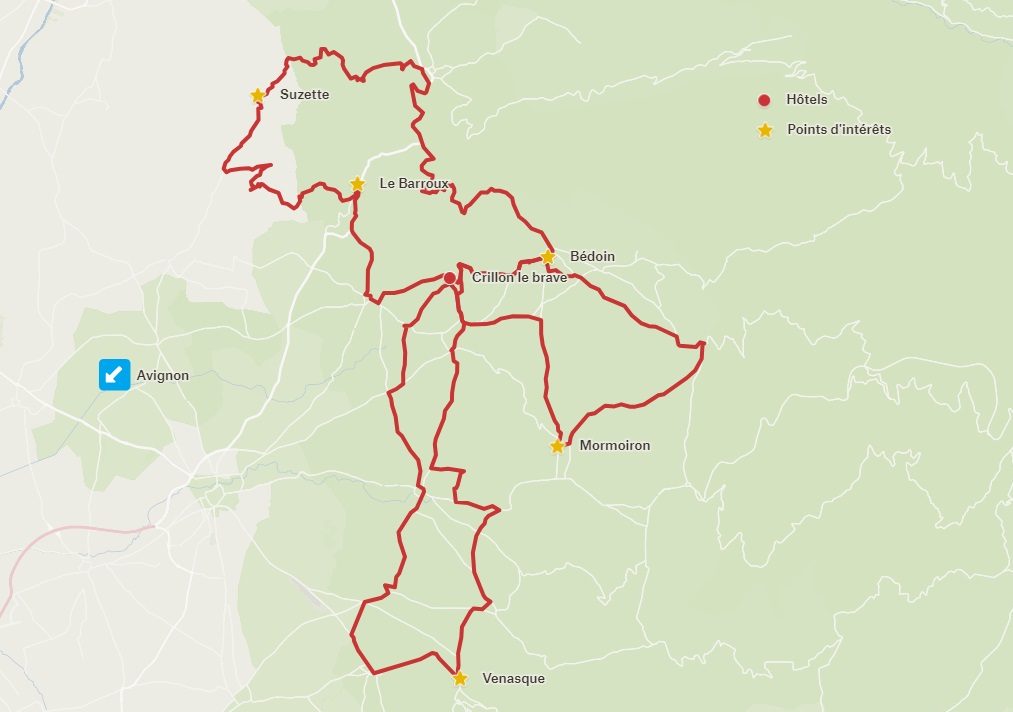Une balade qui vous fait découvrir le Piémont du Ventoux. De Crillon le Brave, vous allez pédalez au cœur de Bédoin, village mondialement connu puisqu’il marque le départ de l’ascension du Mont Ventoux. Après Bédoin, vous longerez le pied du Ventoux et traverserez de charmants hameaux et de paisibles villages. Une balade offrant de jolis points de vue sur de petites routes sillonnant entre les vignes et les cerisiers.