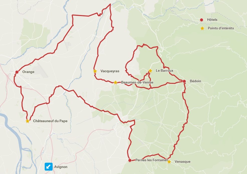 Avec un départ et une arrivée à Pernes les Fontaines, l’itinéraire vous fait remonter vers le nord et ses plaines en direction des célèbres vignobles de Châteauneuf du Pape et d’Orange où vous logerez une nuit. Vous prendrez ensuite la route vers le massif des dentelles de Montmirail. Vous traverserez de charmants villages et croiserez de nombreux caves pour y déguster des vins typiques de la région comme Vacqueyras et Beaume de Venise pour terminer votre journée à Bédoin. A Bédoin au pied du Mont Ventoux, plusieurs boucles sont à votre disposition pour explorer les environs et ses particularités.